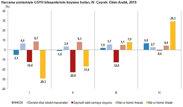 Yerleşik hanehalklarının ve hanehalkına hizmet eden kar amacı olmayan kuruluşların (HHKOK) toplam nihai tüketim harcamaları, 2019 yılının dördüncü çeyreğinde bir önceki yılın aynı çeyreğine göre zincirlenmiş hacim endeksi olarak %6,8 arttı. Devletin nihai tüketim harcamaları %2,7 artarken gayrisafi sabit sermaye oluşumu %0,6 azaldı.