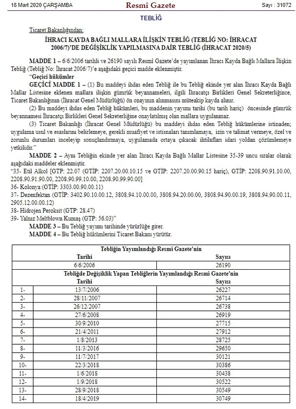 Ticaret Bakanlığından: İHRACI KAYDA BAĞLI MALLARA İLİŞKİN TEBLİĞ (TEBLİĞ NO: İHRACAT 2006/7)'DE DEĞİŞİKLİK YAPILMASINA DAİR TEBLİĞ (İHRACAT 2020/5)