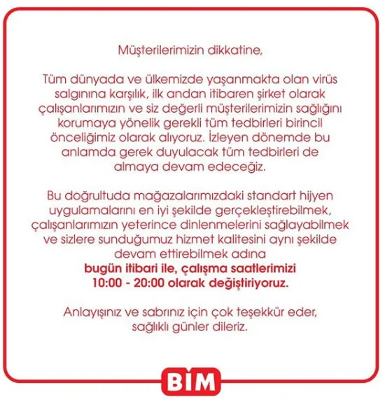 "Aldığımız tavsiye kararı, üyemiz marketlerin 26 Mart Perşembe gününden itibaren çalışma saatlerini haftanın yedi günü 10.00 açılış ve 20.00 kapanış olarak düzenlemeleri yönündedir. Çalışanlarımızın işe geliş gidiş koşullarını, mağaza içinde oluşacak yoğunlukları, ürün tedarik süreçlerimizi ve market içi sağlıklı hizmet için genel hijyen çalışmalarını dikkate alarak bu kararı verdik. Müşterilerimizin acil ihtiyaçları haricinde evden çıkmamaya özen göstereceklerine ve alışverişleri için bu saatlere dikkat edeceklerine inanıyoruz. Market içinde ve dışında sosyal mesafe kuralına uyulmalı. Alınan tedbirler hem toplumun hem de market çalışanlarının sağlığının korunması açısından önemli."