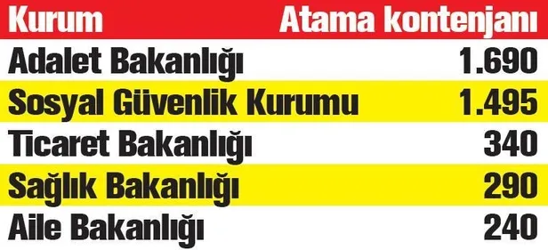Kamuda yeni istihdam için düğmeye basıldı. Cumhurbaşkanı kararıyla kamu idare, kurum ve kuruluşlarına 6 bin 219, üniversitelere ise bin 16 ek atama izni verildi. Atamalarda başı bin 690 kişi ile Adalet Bakanlığı, bin 495 kişiyle Sosyal Güvenlik Kurumu, 340 kişiyle Ticaret Bakanlığı, 290 kişiyle Sağlık Bakanlığı, 240 kişiyle Aile, Çalışma ve Sosyal Hizmetler Bakanlığı çekiyor. Adalet Bakanlığı'nın bin 690 kişilik atama kontenjanının 400'ü idare memuru, 160'ı cezaevi katibi ve bini icra müdür yardımcısı için kullanılacak.