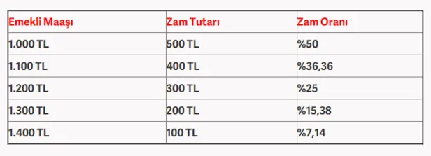 Maaşı 1.500 liranın altında olan emeklilerin gelirinde yüzde 50'ye varan artış olacak. Artıştan kapsamdaki emeklilerin maaşını alan eş ve çocukları da hisseleri oranında yararlanacak. Maaşı bin 100 lira olan 400 lira, yani yüzde 36.36; bin 200 lira olan 300 lira, yani yüzde 25; bin 300 lira olan 200 lira, yani yüzde 15.38; bin 400 lira olan 100 lira, yani yüzde 7.14 zam alacak.