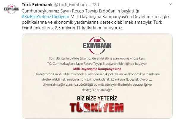 Türk Eximbank, Milli Dayanışma Kampanyası'na 2,5 milyon TL katkıda bulundu. Türk Eximbank'ın twitter hesabından yapılan açıklamada, "Cumhurbaşkanımız Sayın Recep Tayyip Erdoğan'ın başlattığı #BizBizeYeterizTürkiyem Milli Dayanışma Kampanyası'na Devletimizin sağlık politikalarına ve ekonomik yardımlarına destek olabilmek amacıyla Türk Eximbank olarak 2,5 milyon TL katkıda bulunuyoruz." denildi.
