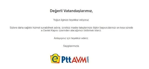 "Sağlık Bakanlığı ile Ulaştırma ve Altyapı Bakanlığının koordinasyonunda 'https://maske.epttavm.com' üzerinden yapılacak başvurulara kısa sürede yoğun bir ilgi oldu. Sizlere daha sağlıklı hizmet sunabilmek adına, ücretsiz maske taleplerinize ilişkin başvurularınızı en kısa sürede e-Devlet Kapısı üzerinden alacağımızı bildirmek isteriz. Anlayışınız için teşekkür ederiz"