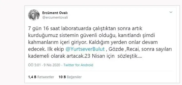 Ovalı, Twitter hesabından yaptığı açıklamada, "7 gün 16 saat laboratuvarda çalıştıktan sonra artık kurduğumuz sistemin güvenli olduğu kanıtlandı. Şimdi kahramanlarım içeri giriyor. Kaldığım yerden onlar devam edecek. İlk ekip @YurtseverBulut, Gözde, Recai, sonra sayıları kademeli olarak artacak. 23 Nisan için sözleştik" ifadelerini kullandı.