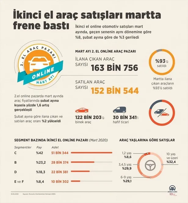 Otomotiv Distribütörleri Derneğince (ODD) INDICATA verilerine göre İkinci el online otomotiv satışları mart ayında, geçen senenin aynı dönemine göre yüzde 8, şubat ayına göre de yüzde 3 geriledi. Mart ayında ikinci el online pazarda satılan araçların yüzde 30’unu 3,4 ve 5 yaşındaki araçların, yüzde 32’sini de 10 yaş ve üzeri araçlar oluşturması dikkati çekti.