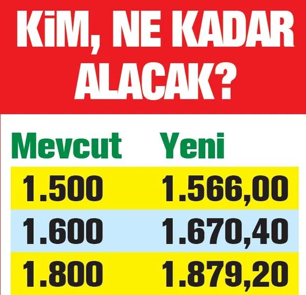 Emeklilere yönelik zam düzenlemesinden, maaşı bin 500 liranın altında olan yaklaşık 650 bin SSK ve Bağ- Kur emeklisi yararlanacak. Bin 500 liranın altındaki maaşlar bin 500 liraya tamamlanacak. Emeklilerin gelirinde 500 liraya varan artış yaşanacak. Düzenlemenin hızla hayata geçirilmesi planlanıyor. Eğer yasa hızla çıkarsa, kapsamdaki emekliler 17-28 Nisan tarihleri arasında ödemelerini ceplerine koyacak.