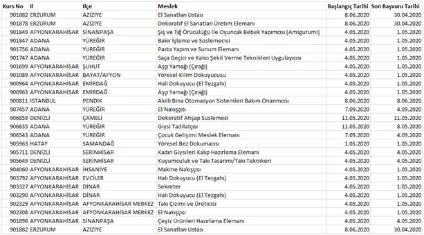 Yeni açılan MEK kursları ve kursların ilan numaraları aşağıda yer almaktadır. Adaylar https://esube.iskur.gov.tr/Kurs/KursOnAir.aspx?ProgramTur=1 adresinden kurslara erişim sağlayabilmektedir.