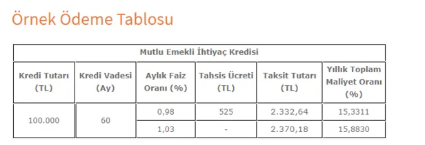 Maaşını Bankamızdan alan veya maaşını Bankamıza aktarmayı taahhüt eden emekli müşterilerimizin tüm nakit ihtiyaçları için aylık %0,98'den başlayan faiz oranları ve bütçelerine uygun geri ödeme seçenekleriyle 100.000 TL'ye kadar 60 ay vadeli kredimizdir.