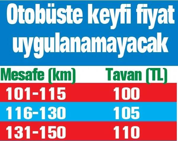 2001 ve üzeri yol mesafesinde ise 500 lira tavan ücret uygulanacak. Tavan ücret tarifesi KDV dahil olarak tespit edilirken, çocuklar ve engelliler için yapılan zorunlu indirimler ayrıca uygulanacak.