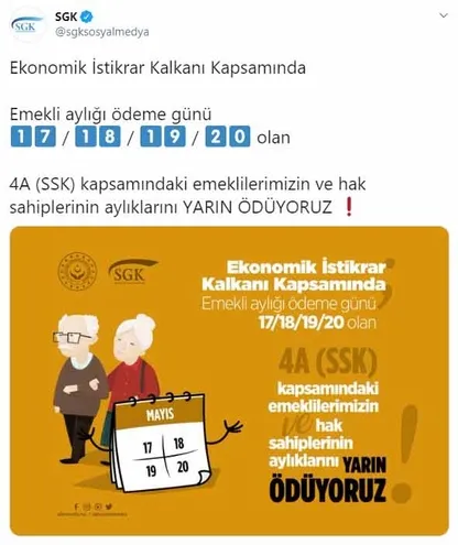 Buna göre 4A (SSK) kapsamında olanlardan normalde ödeme günü; 17, 18, 19, 20 olanlara 15 Mayıs'ta, 21, 22, 23 olanlara 18 Mayıs'ta, 24, 25, 26 olanlara ise 20 Mayıs'ta emekli aylıkları ödenecek.