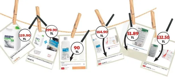 Cerrahi maskede 1 TL olarak belirlenen fiyatları arkadan dolanarak delen mağazalar bu kadar da olmaz dedirtiyor. Dezenfektanın yanına maske ekleyerek paket yapan uyanıklar maske fiyatını da katlıyor. Örneğin bir litrelik dezenfektan ve 50'lik pakete 132 TL fiyat koyarken, aynı dezenfektanın tekli satışındaki etiket fiyatı 50 TL. Bu durumda 50'lik maskenin fiyatı 82 liraya gelirken bir adet maske de 1.60 liradan satılarak tavan fiyat deliniyor.