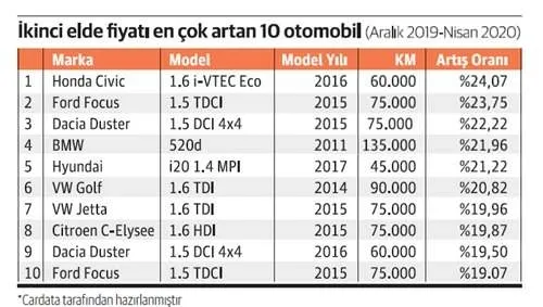 Sıfır araçta ciddi arz sorunu olduğuna değinen Cardata Genel Müdürü Hüsamettin Yalçın da, "Şu anda, 2. el araç fiyatları yaşanan talep patlamasından dolayı yükselmeye devam ediyor. Markalar, mayıs ayı itibariyle yeniden üretime döndü ama bu dönüş az kapasite ve az üretimle gerçekleşiyor. Yani önümüzdeki mayıs, haziran ve temmuz döneminde de ikinci ele olan talep devam edecektir. Diğer yandan, kurdaki artışın araç fiyatlarına yansıması nedeniyle sıfır kilometre fiyatlarının bugünden yüzde 7-8 oranında daha yukarıda olacağını öngörmekteyiz. Sonuç olarak, ikinci elde yükselen fiyatların geri gelmeyeceğini, aksine belirli bir ölçüde artmaya devam edeceğini düşünüyoruz" açıklamasında bulundu.