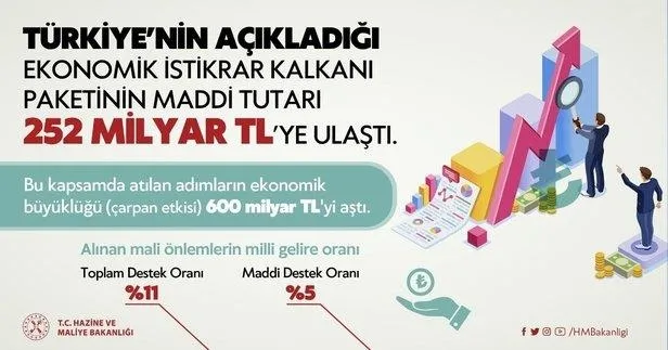 ● Ekonomik İstikrar Kalkanı Paketi'nin maddi tutarı 252 milyar liraya ulaşırken, bu kapsamda atılan adımların ekonomik büyüklüğü (çarpan etkisi) 600 milyar lirayı aştı.