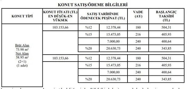 Toplu Konut İdaresi Başkanlığı yayımladığı duyursunda söz konusu satışlar için belirlenen fiyatın 103 bin TL olduğunu duyurdu. 2+1 olarak satışa çıkarılan konutların brüt yaklaşık 74 metrekare net ise 58 metrekare olduğunu duyuran kurum ödeme seçeneklerini de açıkladı.