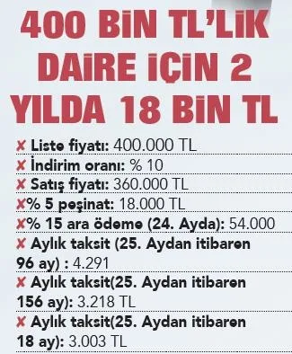 Kampanyaya dahil olan 26 konut projesinde yaklaşık 10 bin konut bulunuyor. İstanbul, Ankara, İzmir, Denizli, Niğde'de bulunan konutların fiyatları 400 bin liradan başlıyor. Örnek ödeme planına göre 400 bin liralık konut yüzde 10 indirimle 360 bin liraya gelecek. 360 bin liralık konut için yüzde 0.79 faizle 10 yıl vadede aylık ödeme 4 bin 654 lira olacak ve vatandaş 24 ay sonra ödemeye başlayacak. Kampanya dahilinde yüzde 5 peşinat ödemesi ise 18 bin lira olacak. Geriye kalan yüzde 15'lik ödeme olan 54 bin lira ise 24 aylık dönem sonunda ödenecek.