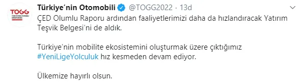 Son dakika haberleri... TOGG'un açıklamasında, "ÇED Olumlu Raporunun ardından faaliyetlerimizi daha da hızlandıracak Yatırım Teşvik Belgesi'ni de aldık. Türkiye'nin mobilite ekosistemini oluşturmak üzere çıktığımız 'Yeniliğe Yolculuk' hız kesmeden devam ediyor" denildi.