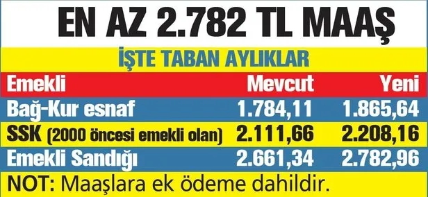 Buna Haziran ayı enflasyon verisi eklenecek, zam oranları belli olacak. Haziran enflasyonuna göre zam oranı artacak ya da azalacak. Şu ana kadar oluşan yüzde 4.57'lik artışa göre; 2000'den önce emekli olan SSK'lılarda taban maaş 2 bin 111 liradan 2 bin 208 liraya çıkacak. Memur emeklilerinde 2 bin 661 liradan 2 bin 782 liraya yükselen en düşük maaş, esnaf emeklilerinde ise bin 784 liradan bin 865 liraya ulaşacak.