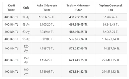 400.000 TL KREDİ GERİ ÖDEME TABLOSU