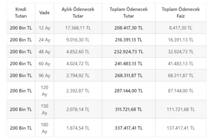 200.000 TL KREDİ GERİ ÖDEME TABLOSU