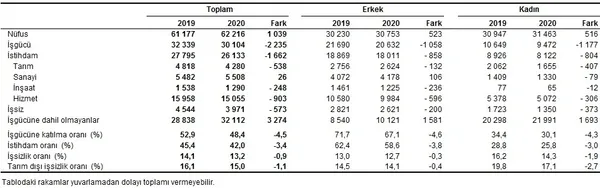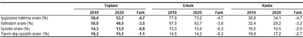 İşgücü 2020 yılı Mart döneminde bir önceki yılın aynı dönemine göre 2 milyon 235 bin kişi azalarak 30 milyon 104 bin kişi, işgücüne katılma oranı ise 4,5 puanlık azalış ile %48,4 olarak gerçekleşti.
