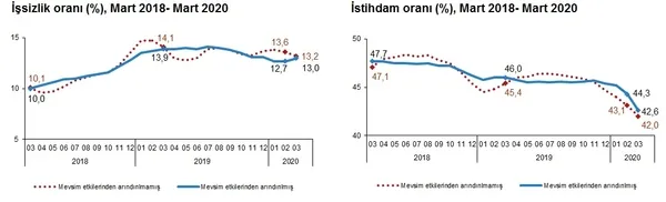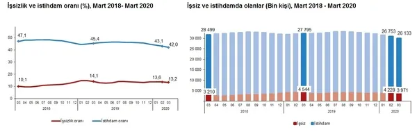Türkiye genelinde 15 ve daha yukarı yaştakilerde işsiz sayısı 2020 yılı Mart döneminde geçen yılın aynı dönemine göre 573 bin kişi azalarak 3 milyon 971 bin kişi oldu. İşsizlik oranı 0,9 puanlık azalış ile %13,2 seviyesinde gerçekleşti. Tarım dışı işsizlik oranı 1,1 puanlık azalış ile %15,0 oldu.