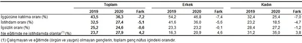 15-24 yaş grubunu kapsayan genç nüfusta işsizlik oranı bir önceki yılın aynı dönemine göre 0,6 puan azalışla %24,6, istihdam oranı ise 5,1 puan azalarak %27,4 oldu. Aynı dönemde işgücüne katılma oranı 7,2 puanlık azalışla %36,3 seviyesinde gerçekleşti. Ne eğitimde ne de istihdamda olanların oranı ise bir önceki yılın aynı dönemine göre 4,2 puanlık artışla %27,9 seviyesinde gerçekleşti.