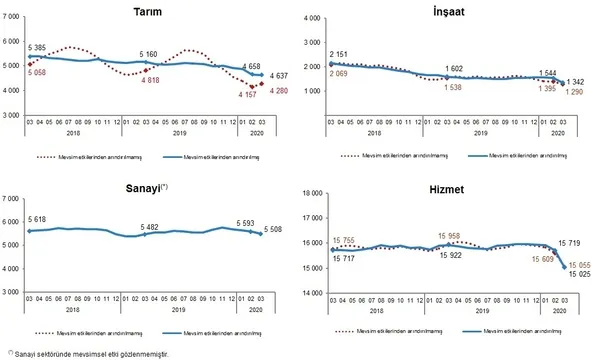 Ekonomik faaliyete göre, mevsim etkilerinden arındırılmış istihdam, tarım sektöründe 21 bin kişi, sanayi sektöründe 85 bin kişi, inşaat sektöründe 202 bin kişi, hizmet sektöründe 694 bin kişi azaldı.