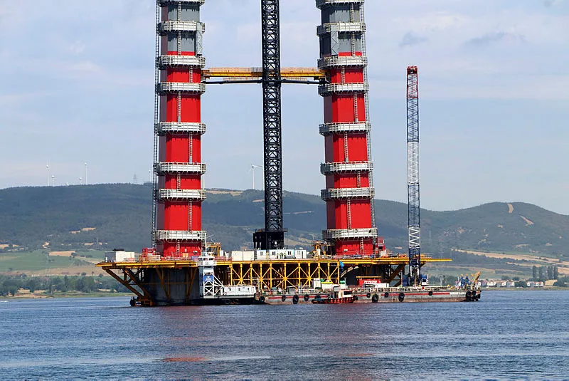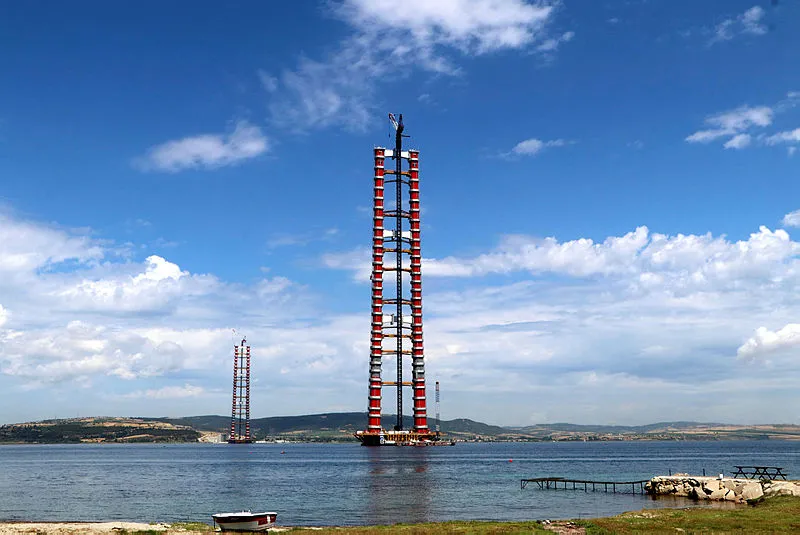 Hemen ardından Sütlüce'de kurulan şantiyede, kuru havuzda neredeyse her biri 1'er futbol sahası büyüklüğündeki 2 kule kesonu inşa edildi. Denizin dibine çakılan demir kazıkların üzerine geçen yılın Mayıs ayında batırılan kule kesonları üzerine ilk bloklar, ağustos ayında konuldu ve kırmızı- beyaz renkleriyle Türk bayrağını simgeleyen köprü ayakları yükselmeye başladı. Aradan geçen 9 aylık sürede 318 metre yüksekliğindeki köprü ayakları tamamlandı. Gelibolu yakasındaki köprü ayaklarına 32'nci blokların montajının yapılmasının ardından Lapseki yakasında köprü ayağına son blokun montajı, Cumhurbaşkanı Erdoğan'ın telekonferans ile katıldığı törenle geçen ay gerçekleştirildi.