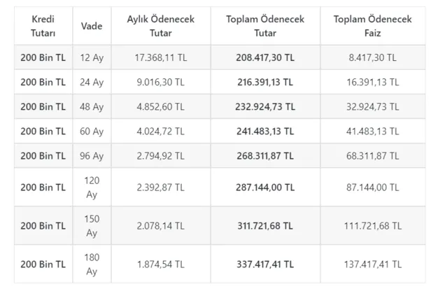 200.000 TL KREDİ GERİ ÖDEME TABLOSU