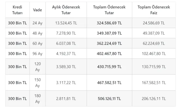300.000 TL KREDİ GERİ ÖDEME TABLOSU