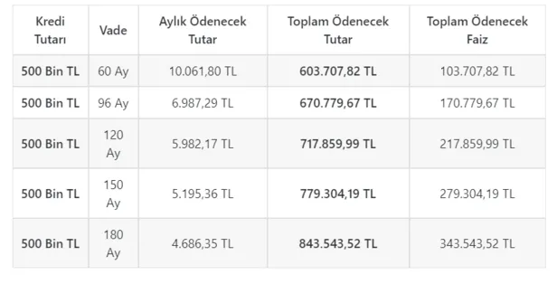 500.000 TL KREDİ GERİ ÖDEME TABLOSU