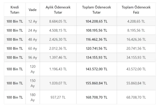 100.000 TL KREDİ GERİ ÖDEME TABLOSU