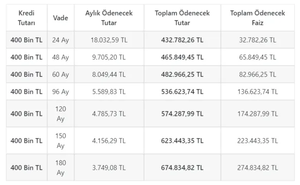 400.000 TL KREDİ GERİ ÖDEME TABLOSU