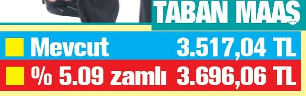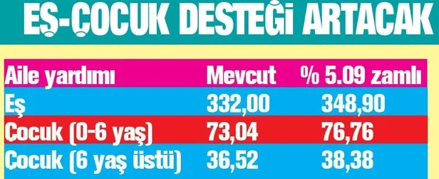 Merkez Bankası'nın beklenti anketindeki enflasyon tahminine göre zam oranı, enflasyon farkıyla yüzde 5.09'a çıkacak. Bu durumda aile yardımı hariç en düşük maaş 3 bin 517 liradan 3 bin 696 liraya yükselecek. Eş yardımı 332 liradan 348,90 liraya, çocuk yardımı da 0-6 yaş arası için 73,04 liradan 76,76 liraya, üstü için 36,52 liradan 38,38 liraya çıkacak.
