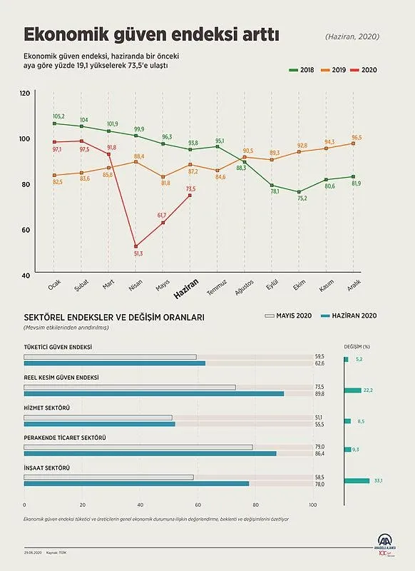 Buna göre, endeks bu ay mayısa göre yüzde 19,1 artarak 73,5 değerine ulaştı. Ekonomik güven endeksindeki artış, tüketici, reel kesim (imalat sanayisi), hizmet, perakende ticaret ve inşaat sektörü güven endekslerindeki artışlardan kaynaklandı.