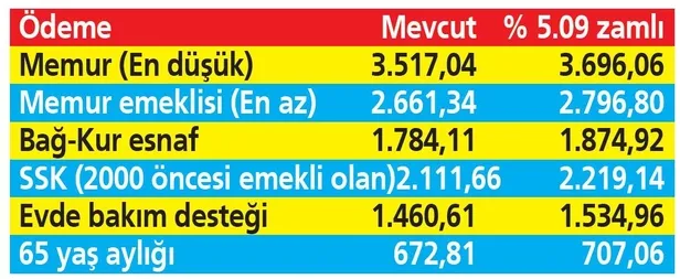 Yani 5 aylık enflasyona göre; SSK ve Bağ-Kur emeklilerinin zam oranı yüzde 4.57 olurken, memurlara ve emeklilerine de yüzde 4'lük artışa ilaveten yüzde 0.57 fark oluştu. Bu şekilde 5 aylık rakamlara göre en düşük emekli maaşı esnafta bin 865, memurda 2 bin 782, 2000'den önce emekli olan SSK'lılarda 2 bin 208 liraya yükselirken, kesin oran için 1 veri kaldı. Memur emeklilerinde 2 bin 661 liradan 2 bin 782 liraya yükselen en düşük maaş, esnaf emeklilerinde ise bin 784 liradan bin 865 liraya ulaşacak.