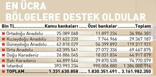 Kredilerin bölge ve il bazındaki dağılımı incelediğinde kamu bankalarının ülkenin her kesiminde, gerek şirketlerin gerekse vatandaşın hayatını kolaylaştırmak için aktif rol oynadığını ortaya koydu. Ağrı, Ardahan, Bayburt Erzincan, Erzurum, Iğdır ve Kars illerini içeren Kuzeydoğu Anadolu Bölgesi'ne verilen 29.4 milyar liralık kredinin yüzde 74'ünü, yani 21.6 milyar liralık kısmını kamu bankaları sağladı. Bingöl, Bitlis, Elazığ, Hakkari, Malatya, Muş, Tunceli ve Van'ı kapsayan Ortadoğu Anadolu'ya verilen 36.9 milyar liralık kredinin de 25.1 milyarını yani yüzde 68'ini kamu bankaları finanse etti. Güneydoğu Anadolu Bölgesi'nde verilen 119.2 milyar liralık kredinin de 62.8 milyarını kamu bankaları sağladı.