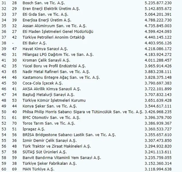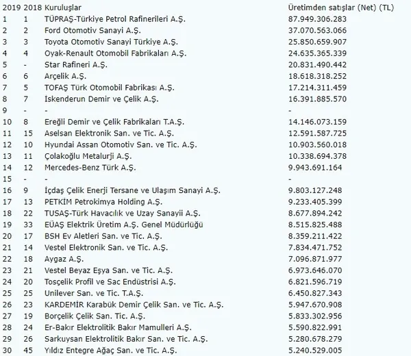 TÜPRAŞ, üretimden satışlarda 87 milyar 949 milyon lirayla listede ilk sırayı alırken, Ford 37 milyar 71 milyon lirayla ikinci, Toyota ise 25 milyar 851 milyon lirayla üçüncü oldu.