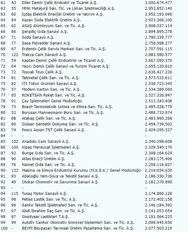 Listede Toyota'yı sırasıyla Oyak-Renault, Star Rafineri, Arçelik, Tofaş, İskenderun Demir ve Çelik takip etti. Dokuzuncu sıradaki şirket isminin açıklanmasını istemezken, Ereğli Demir ve Çelik onuncu basamakta yer aldı.