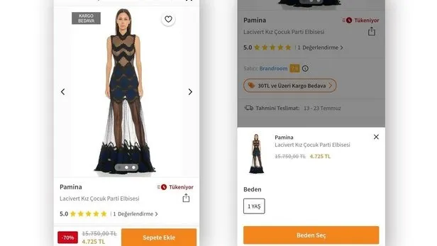 Yukarıda yer alan ve yetişkinlere özel olduğu rahatlıkla anlaşılan parti elbiseleri ise kullanıcıların karşısına çıkan diğer ürünlerden. Beden ekranına gelindiğinde ise "Lacivert Kız Çocuk Parti Elbisesi" ya da "Kemik Kız Bebek Parti Elbisesi" detayları dikkatleri çekmiş durumda. Bu durumun sadece Trendyol mobil site ve uygulamasına özgü olduğu söyleniyor.