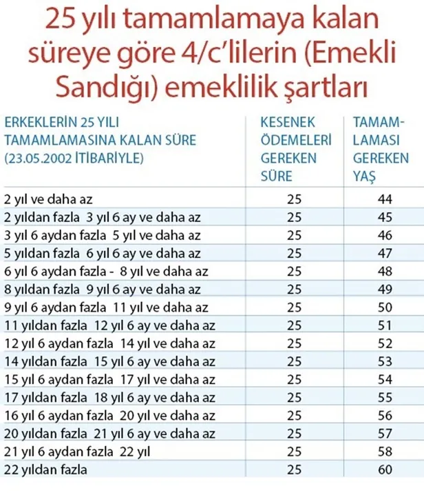 25 YILI TAMAMLAMAYA KALAN SÜREYE GÖRE 4/C'LİLERİN (EMEKLİ SANDIĞI) EMEKLİLİK ŞARTLARI
