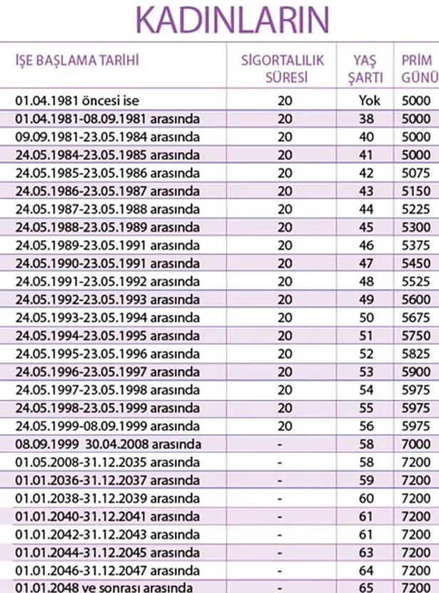 3600 günden emekli olmak için sigorta girişi tarihi şartını yerine getiren kadın çalışanların 15 yıllık sigortalılık süresi ve belirlenen prim gününü doldurma tarihleri emeklilik yaşlarını belirler: