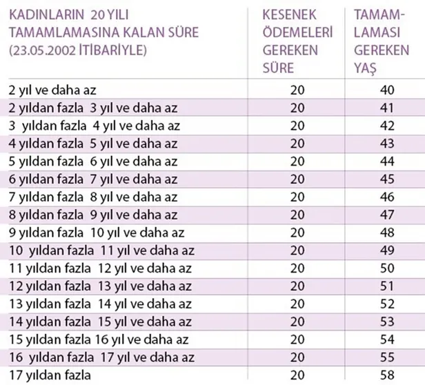 • 9.09.1999 ve öncesinde ilk kez sigortalandırılanlar arasında yer almasına rağmen 31.12.2011 tarihine kadar 3600 prim günü ödemesini doldurmamış olan erkek çalışanlar 59 yaşında, kadın çalışanlar ise 58 yaşında emekli maaşlarını alabilirler.