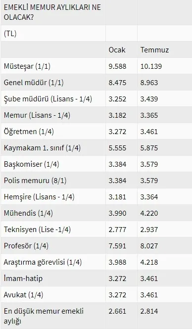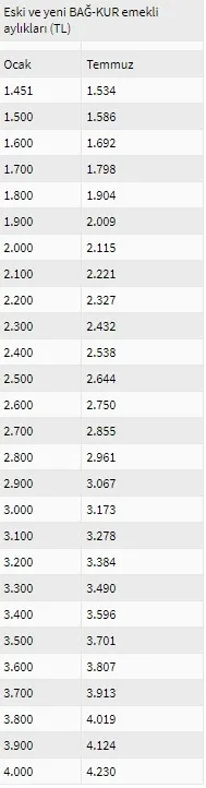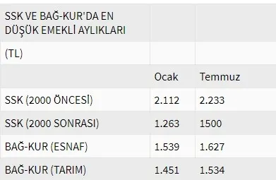 Bu artışla en düşük emekli aylığı 2000 öncesi SSK emeklilerinde 2 bin 112 TL'den 2 bin 233 TL'ye, en düşük esnaf BAĞ-KUR aylığı bin 539 TL'den bin 627 TL'ye, en düşük tarım BAĞ-KUR'lu aylığı da bin 451 TL'den bin 534 TL'ye yükseldi. SSK'dan 2000 sonrasında emekli olanların aylıkları normalde bin 263 TL'den bin 335 TL'ye yükseldi. Ancak, bu yıl en düşük emekli aylığının bin 500 TL'ye yükseltilmesi nedeniyle 2000 sonrası SSK emeklilerinin aylıkları nisan ayında bin 500 TL'ye çıkartıldığı için, temmuz ayında ayrıca bir zam yapılmadı. En düşük emekli memur aylığı da 2 bin 661 TL'den 2 bin 814 TL'ye çıktı. Ödeme tarihleri belli oldu.