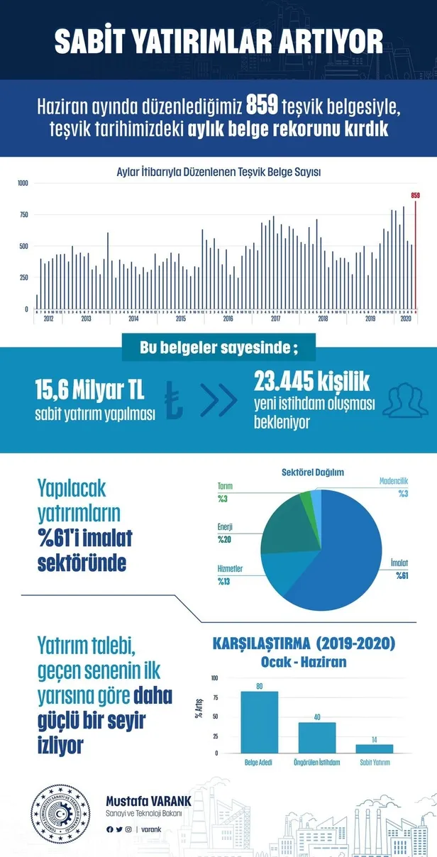 Varank paylaşımında yılın ilk yarısında yatırım talebinin pandemiye rağmen geçen senenin üzerinde olduğuna dikkati çekerek, aylar itibarıyla düzenlenen teşvik belge sayısı ve yatırım teşvik verilerinin bulunduğu infografiğe de yer verdi.