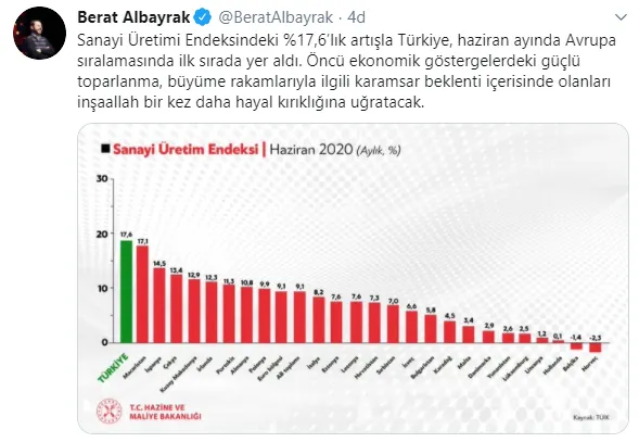 Hazine ve Maliye Bakanı Berat Albayrak'tan sanayi üretimi endeksi mesajı! Türkiye Avrupa'da ilk sırada!