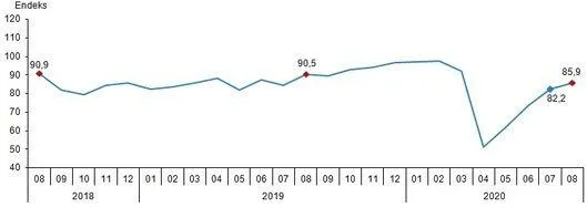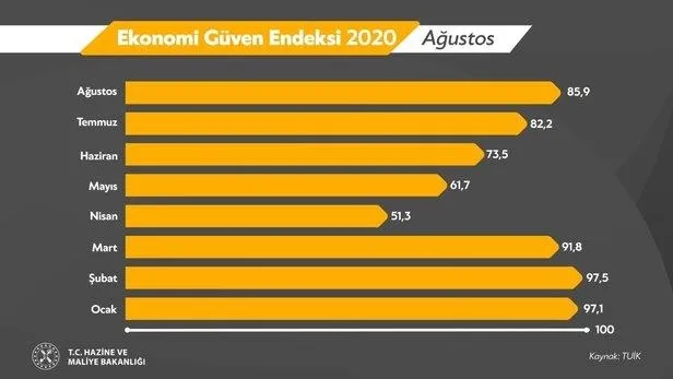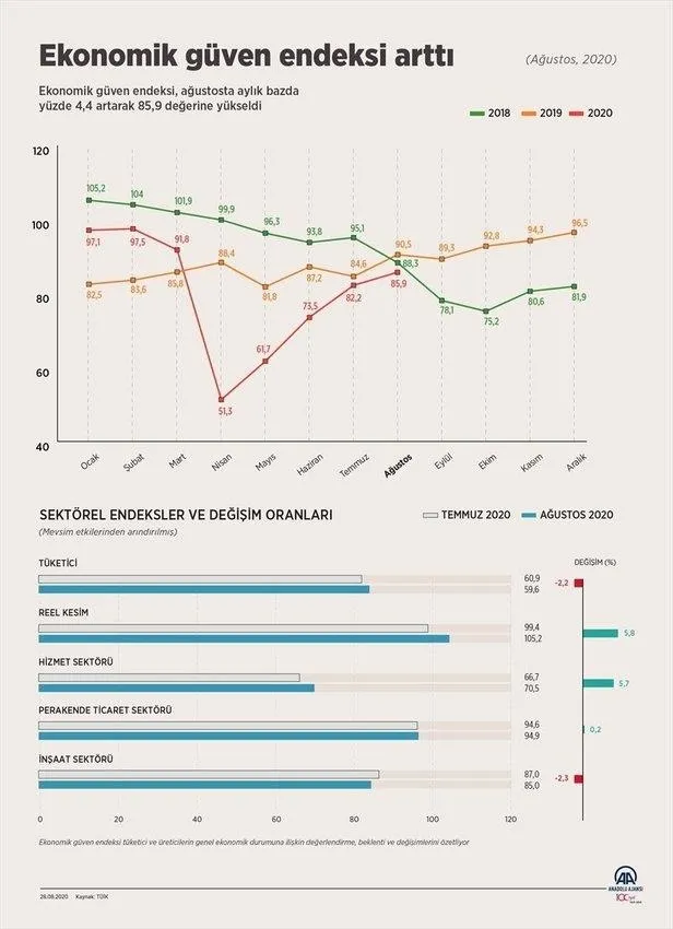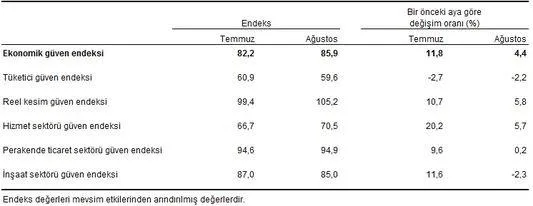 Ekonomik güven endeksi Temmuz ayında 82,2 iken, Ağustos ayında %4,4 oranında artarak 85,9 değerine yükseldi. Ekonomik güven endeksindeki artış, reel kesim (imalat sanayi), hizmet ve perakende ticaret sektörü güven endekslerindeki artışlardan kaynaklandı.