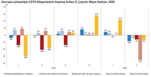 Devletin nihai tüketim harcamaları, 2020 yılının ikinci çeyreğinde bir önceki yılın aynı çeyreğine göre zincirlenmiş hacim endeksi olarak %0,8 azaldı. Yerleşik hanehalklarının tüketim harcamaları %8,6, gayrisafi sabit sermaye oluşumu %6,1 azaldı.