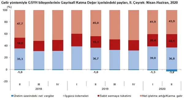 İşgücü ödemelerinin cari fiyatlarla Gayrisafi Katma Değer içerisindeki payı geçen yılın ikinci çeyreğinde %36,7 iken bu oran 2020 yılında %36,8 oldu. Net işletme artığı/karma gelirin payı ise %45,0'dan %43,9'a düştü.
