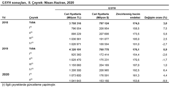 Üretim yöntemiyle GSYH tahmini, 2020 yılının ikinci çeyreğinde cari fiyatlarla bir önceki yılın aynı çeyreğine göre %1,3 artarak 1 trilyon 041 milyar 643 milyon TL oldu. GSYH'nin ikinci çeyrek değeri cari fiyatlarla ABD doları bazında 153 milyar 180 milyon olarak gerçekleşti.
